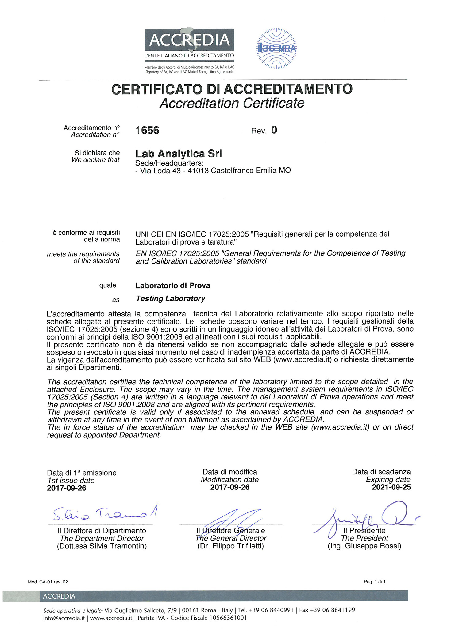 - Accreditato ACCREDIA norma UNI CEI ISO/IEC 17025:2005
